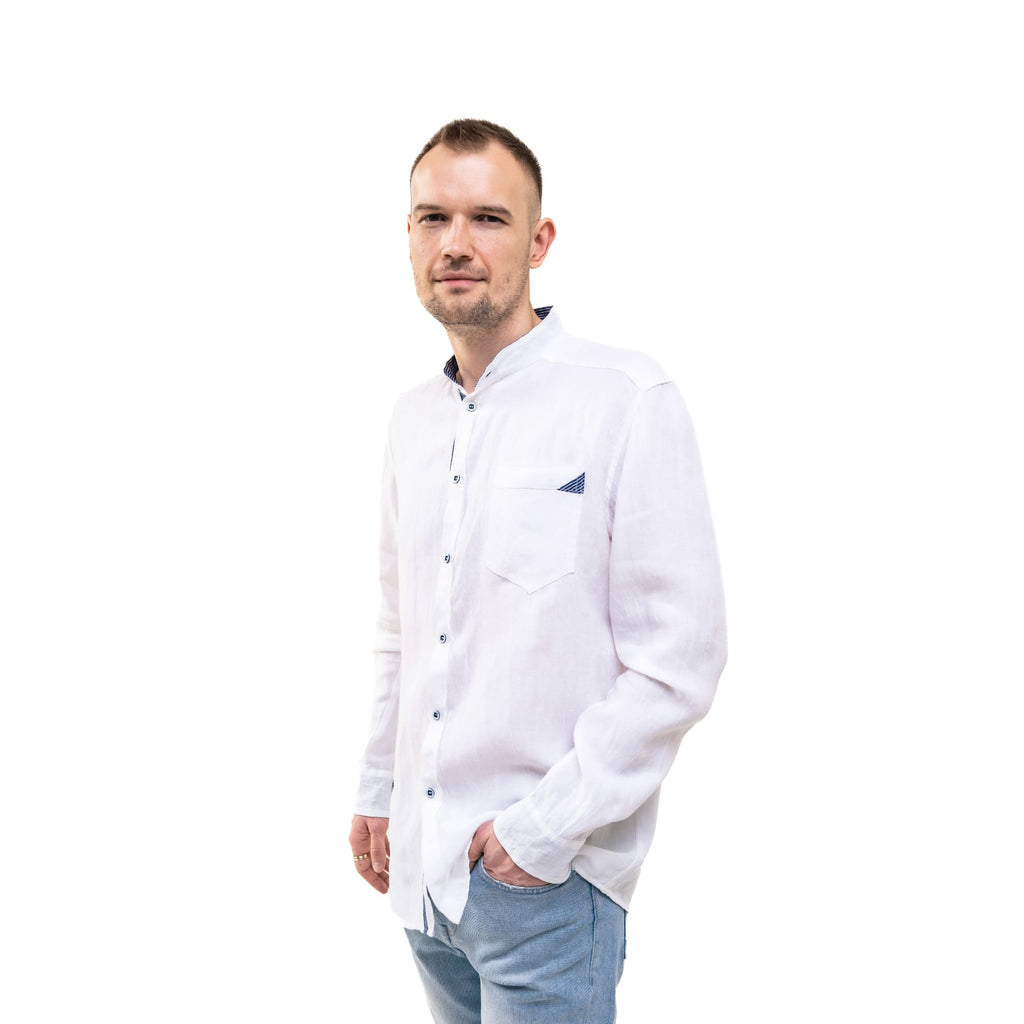 Men`s linen band collar shirt in White with blue
