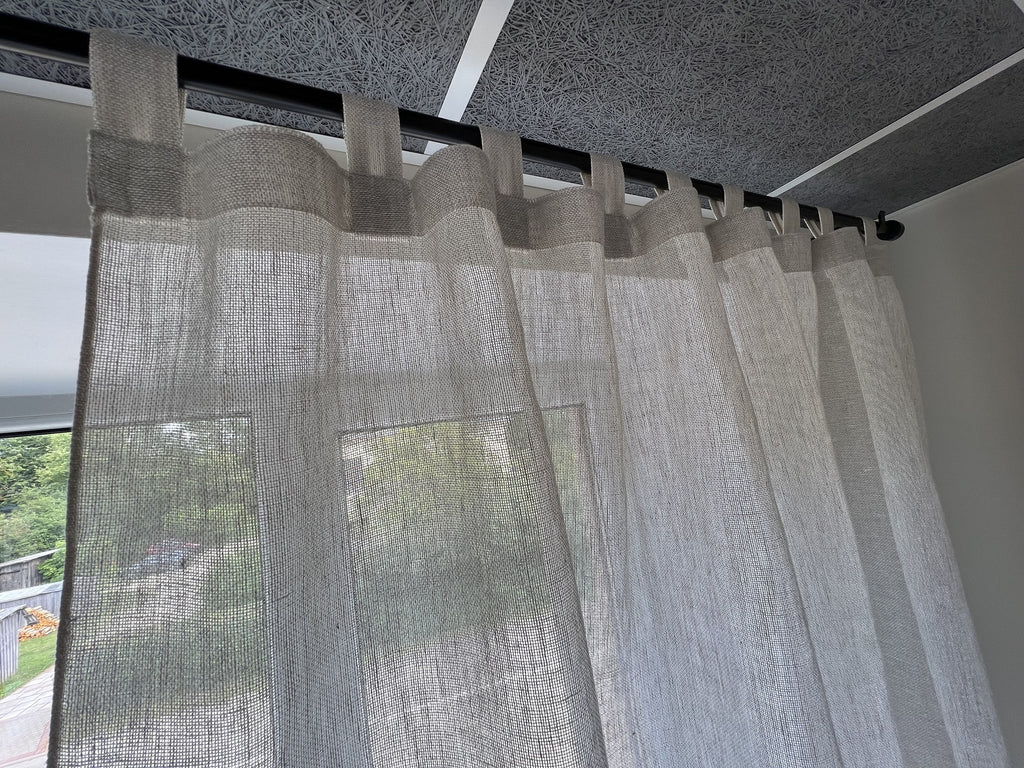 Color: milk white; warm grey (mix of natural linen and milk white color yarn; looks more natural with a tint of beige); natural linen (uncolored natural linen yarn; this color looks good in log buildings and rustic design); bluish grey (mix of natural linen and anthracite color yarn). The curtain seen in the photos is in grey & white color (warm grey).