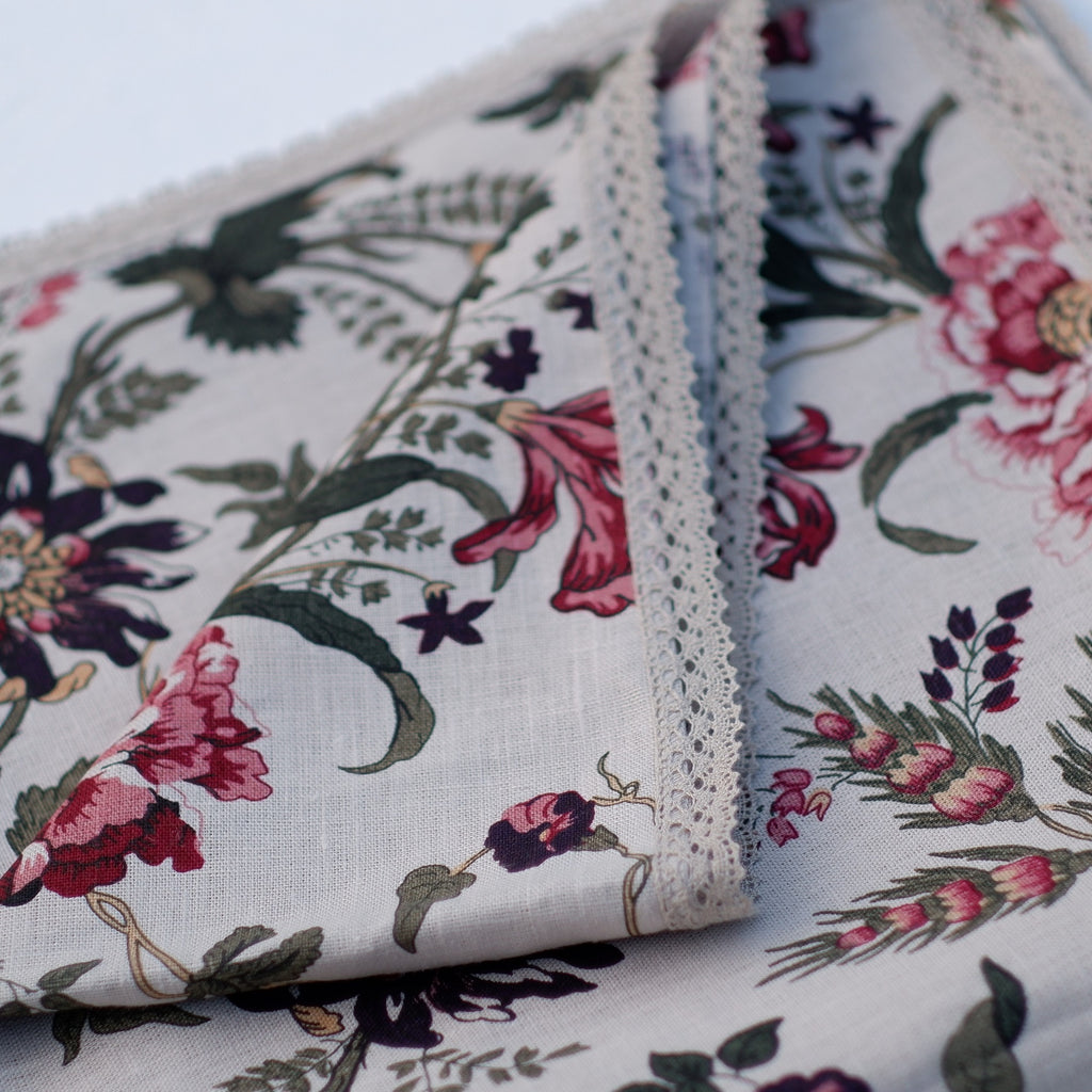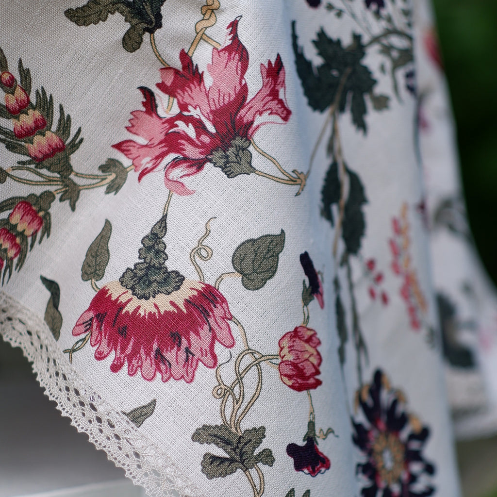 The linen tablecloth is handmade with its unique character. This tablecloth is perfect for indoor and outdoor dining. The colorful print with flowers gives the tablecloth the breath of nature. The tablecloth is offered with white and natural linen colour basement and lace.